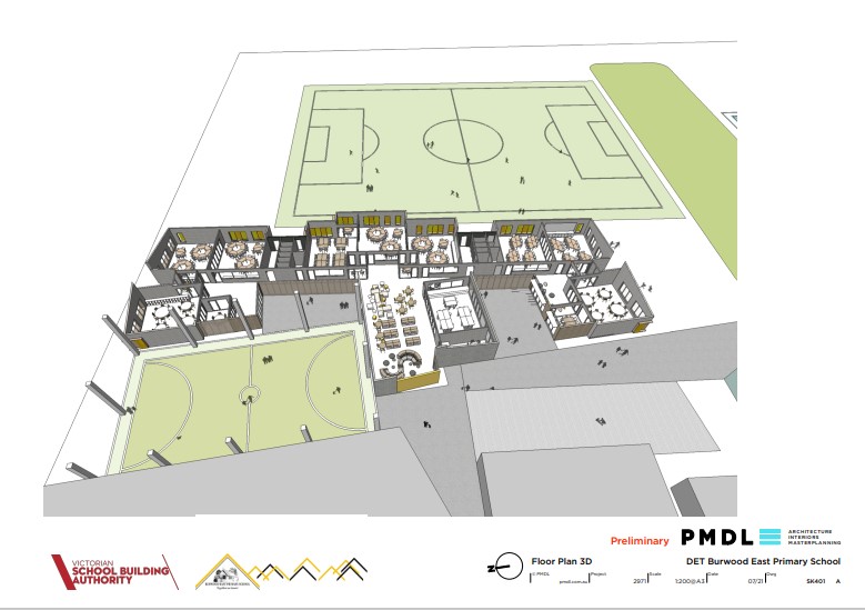 Burwood East Primary School's modernisation process is complete. This has resulted in a state-of-the art new building housing 9 new learning spaces, break-out areas, a substantial Visual Art and STEM space and a huge outdoor covered space with supporting tiered seating.