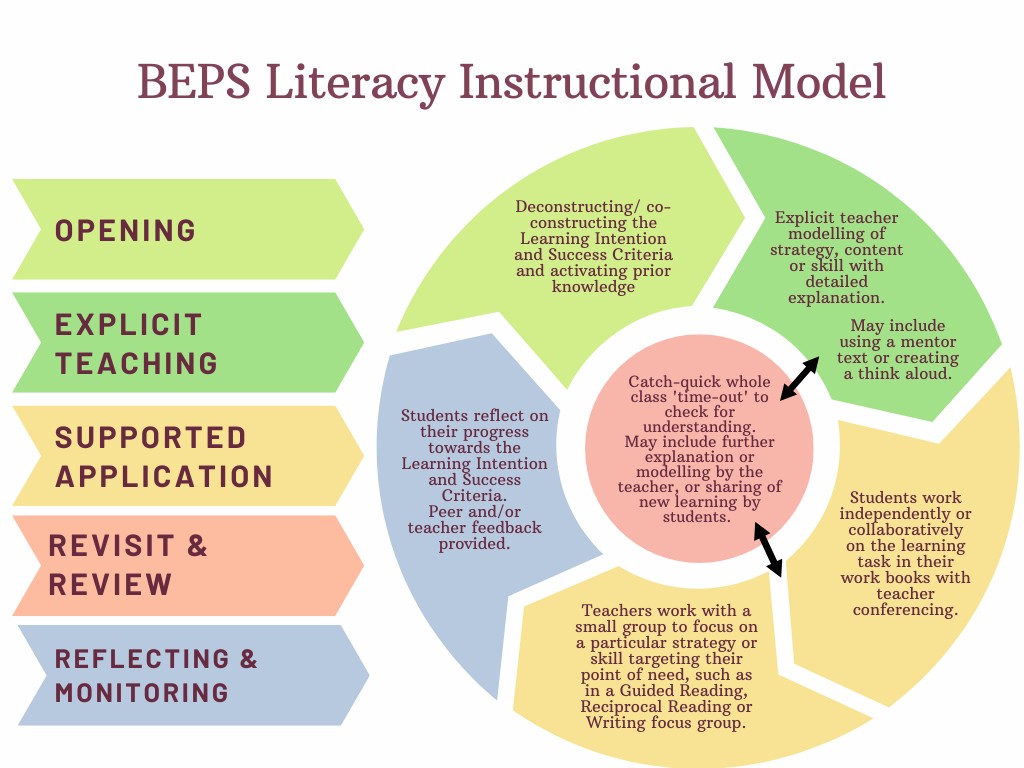 Every session begins with explicit teaching which involves the activation of prior knowledge. A clear understanding of the learning intention and success criteria is developed through discussions and modelling by the teacher, followed by guided and supported application through independent activities and collaborative learning. Teachers confer with small groups or individuals during this time to engage in rich discussions around texts and the progress being made towards students’ learning goals. Students also undertake independent reading, where they focus on their independent learning goals, a ‘reading challenge’ aligned with the week’s learning focus or engage in fluency reading to a teacher or buddy.