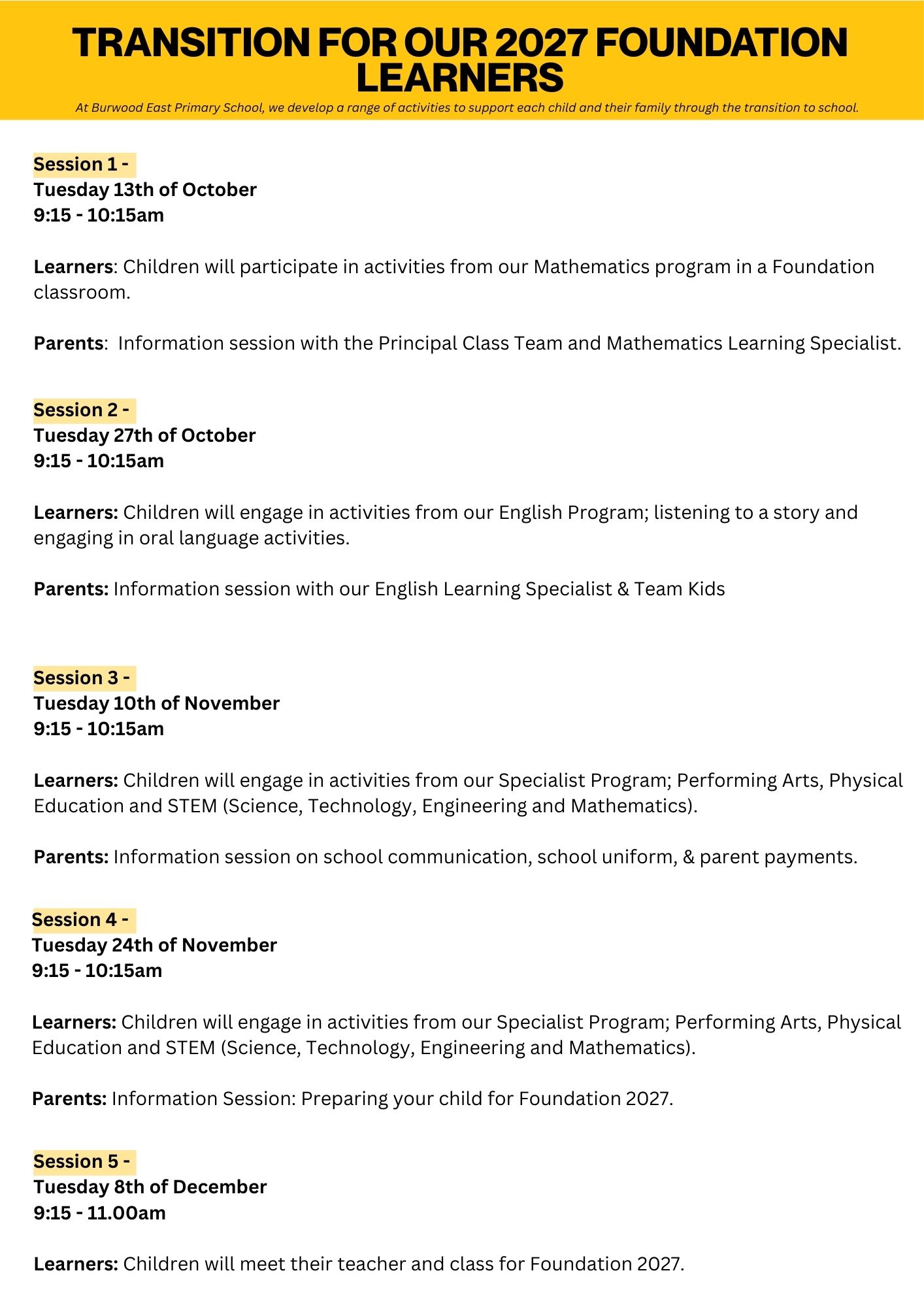 At Burwood East Primary School, we develop a range of activities to support each child and their family through the transition to school program. These transition sessions provide an opportunity for young learners to familiarise themselves with the school environment, allowing them to become comfortable with the physical space, classroom, and facilities of the school. Transition sessions also introduce students to teaching staff and peers, giving students an opportunity to form connections and friendships. You are invited to attend all or some of the transition sessions. While the students are attending their transition session parents will be able to attend information sessions covering a variety of topics that strenghten the parent - school partnership.